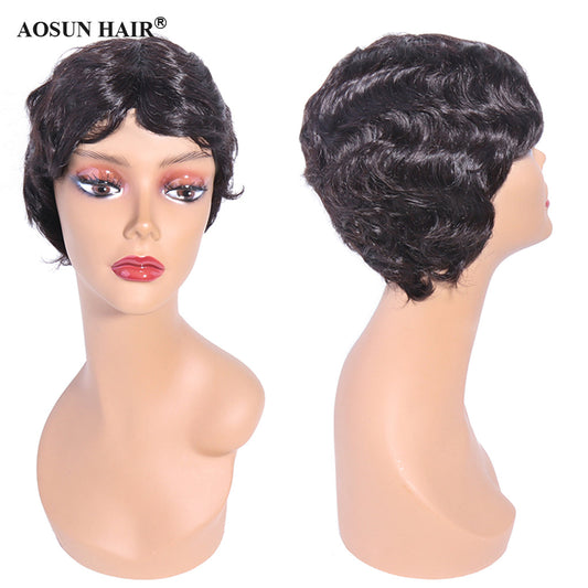 Aosun Short Machine Made Wig None Lace Human Hair Wavy Wigs 130% Density Wear To Go