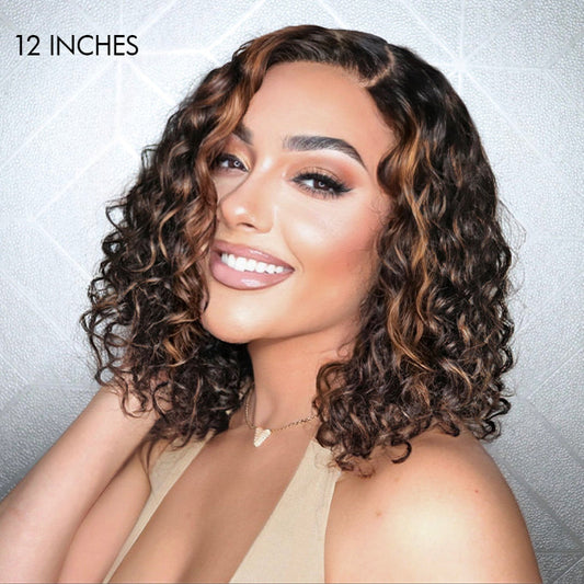 Casual Blonde Highlights Curly Minimalist HD Lace Glueless C Part Short Wig 100% Human Hair
