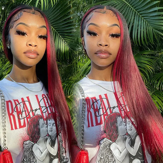 Burgundy 99J & Red Streaks Straight Human Hair Wigs Transparent 13*4 Lace Front Wig